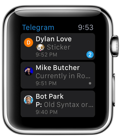 We've made sure that Telegram on Apple Watch does as much as the platform can support right now — and that it does more than any other messaging app out there.