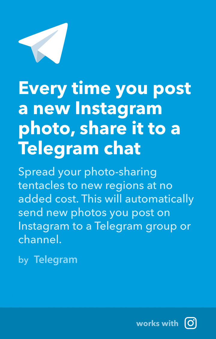 Starting today, you can link your Telegram account with more than 360 other services by setting up “If This Then That” integrations (or “Applets”). This works with anything from social networks like Twitter and Instagram, to productivity tools like Gmail or Pocket, entertainment apps like Spotify or Pinterest, cloud services like Dropbox or Google Drive, and Internet of Things devices like Nest, LIFX, or Philips Hue.